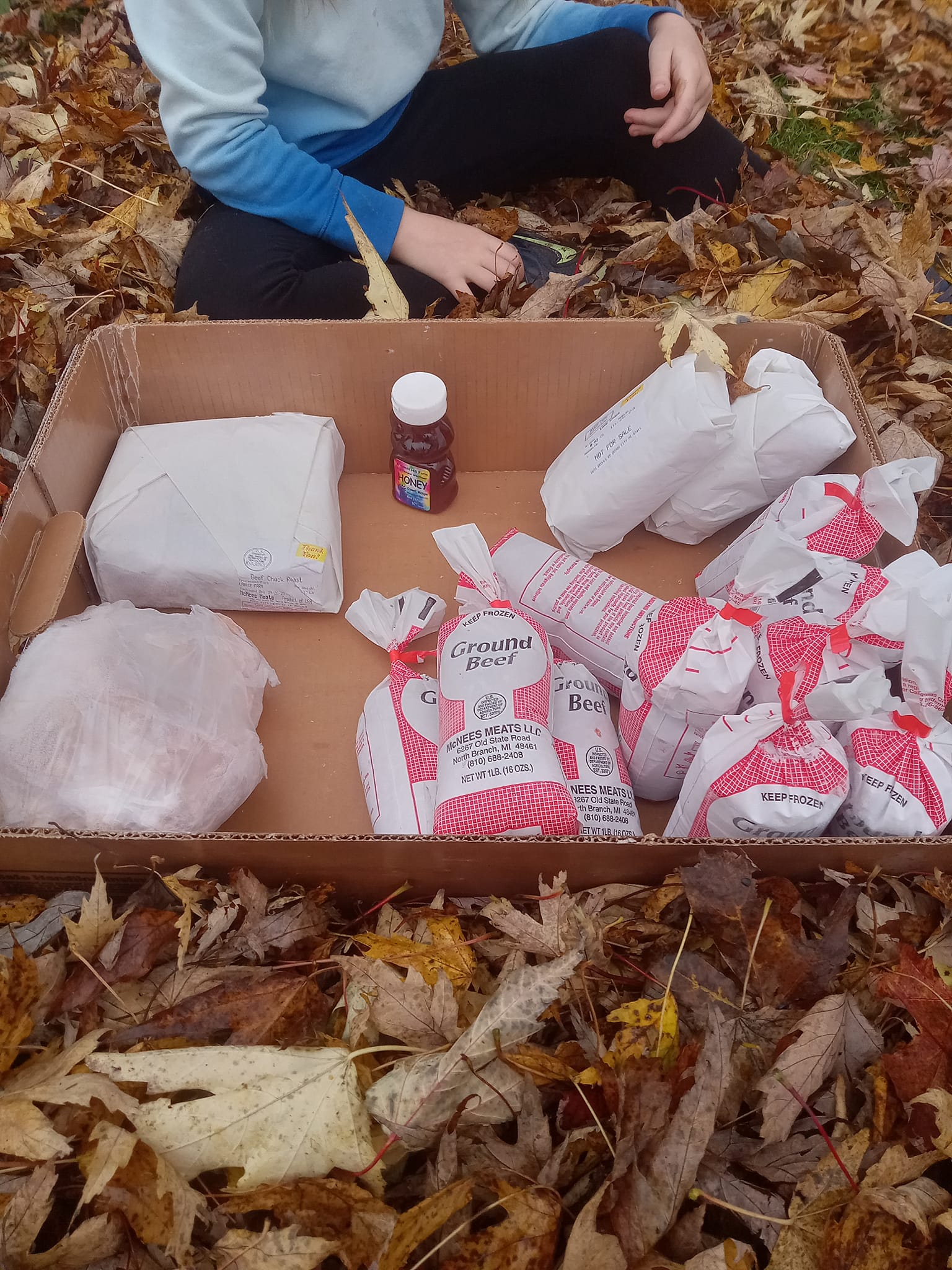 10 lbs ground beef, 2 lbs lamb chops, one whole chicken, 1 chuck roast and a small jar of Michigan made honey. Call for availability/pricing.
